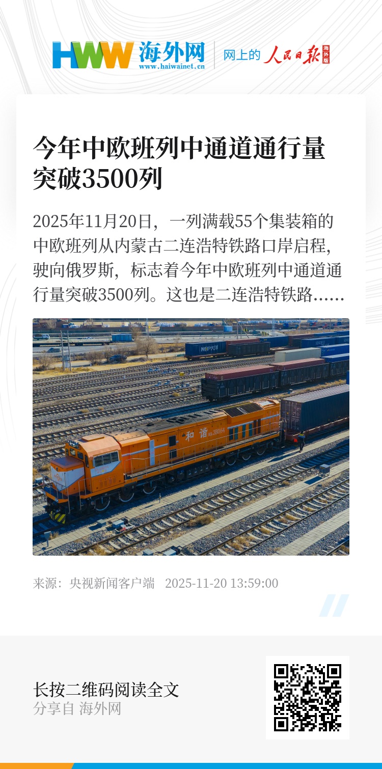 2025年11月20日,一列满载55个集装箱的中欧班列从内蒙古二连浩特铁路口岸启程,驶向俄罗斯,标志着今年中欧班列中通道通行量突破3500列。这也是二连浩特铁路口岸自2013年通行中欧班列以来,首次年内突破3500列大关,创历史新高。