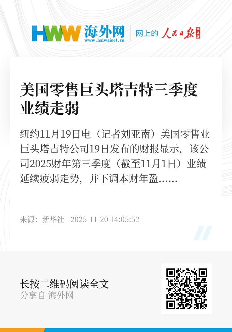 新华社纽约11月19日电(记者刘亚南)美国零售业巨头塔吉特公司19日发布的财报显示,该公司2025财年第三季度(截至11月1日)业绩延续疲弱走势,并下调本财年盈利预期。