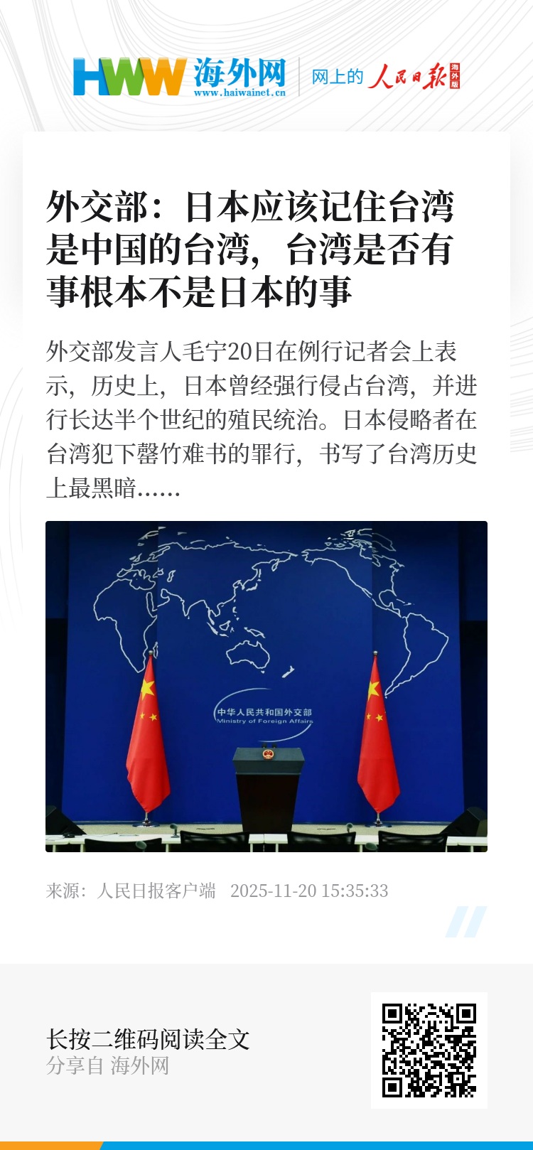 外交部发言人毛宁20日在例行记者会上表示,历史上,日本曾经强行侵占台湾,并进行长达半个世纪的殖民统治。日本侵略者在台湾犯下罄竹难书的罪行,书写了台湾历史上最黑暗的一页。今年是台湾光复80周年。日本应该记住,台湾是中国的台湾。台湾是否有事,根本不是日本的事。借台湾生事,只会给日本找事。
