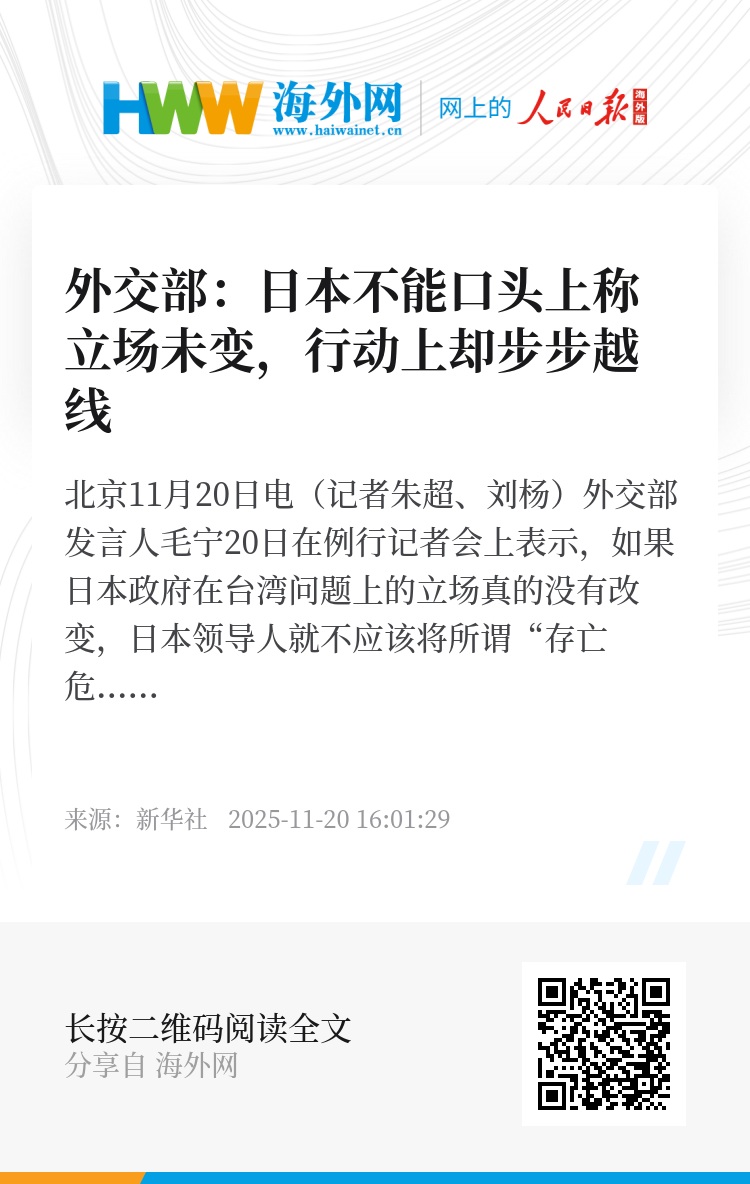新华社北京11月20日电(记者朱超、刘杨)外交部发言人毛宁20日在例行记者会上表示,如果日本政府在台湾问题上的立场真的没有改变,日本领导人就不应该将所谓“存亡危机事态”同台湾问题相关联,不能说一套做一套,口头上称立场未变,行动上却步步越线,仅凭一句立场未变,解决不了中方关切。日方应当认真对待中方的严肃要求,收回错误言论,切实把对华承诺体现在实际行动上。