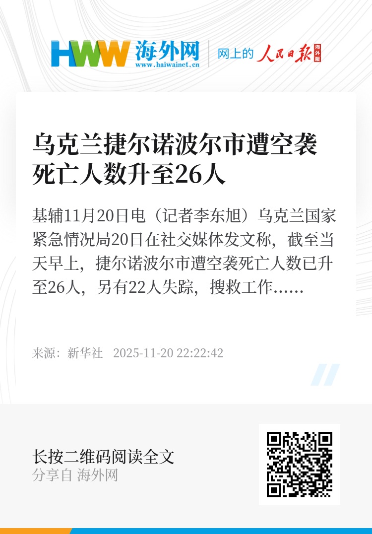新华社基辅11月20日电(记者李东旭)乌克兰国家紧急情况局20日在社交媒体发文称,截至当天早上,捷尔诺波尔市遭空袭死亡人数已升至26人,另有22人失踪,搜救工作仍在进行。