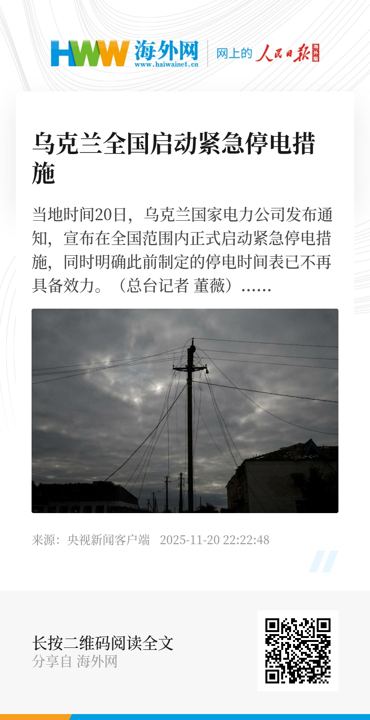 当地时间20日,乌克兰国家电力公司发布通知,宣布在全国范围内正式启动紧急停电措施,同时明确此前制定的停电时间表已不再具备效力。(总台记者 董薇)