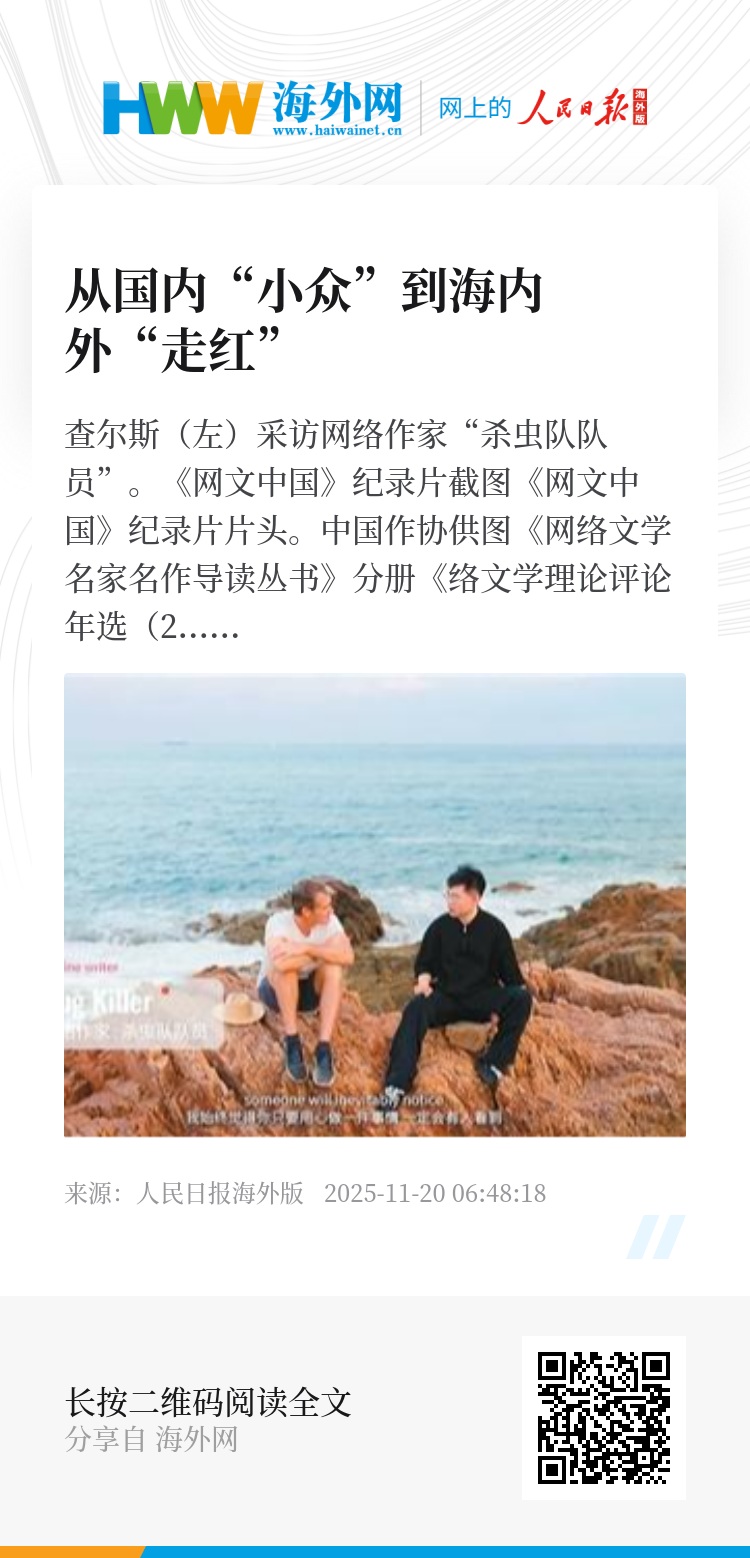 论坛期间,中国作协网络文学中心发布中国网络文学“Z世代”国际传播工程(第三期)成果,新推出6期使用中英双语制作、每期16分钟的《网文中国》纪录片,并在全球同步上线。纪录片邀请法国Chireads(元气阅读)总编辑查尔斯和海外读者,与6位中国网络作家进行深度访谈。该工程旨在通过可视化传播,让中国网络文学作品背后的创作故事、作家经历、中国文化以鲜活生动的形式抵达受众。(本报记者 张鹏禹)