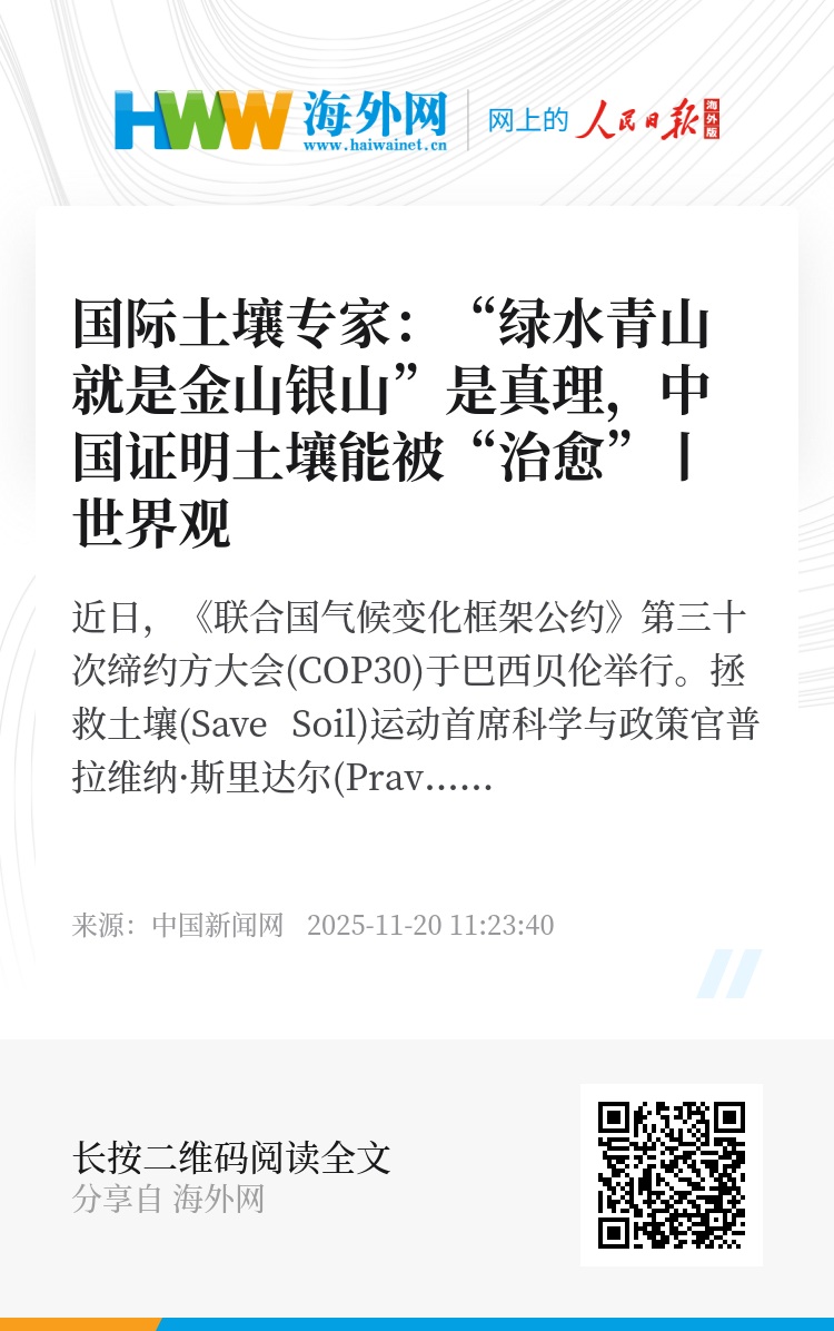 近日,《联合国气候变化框架公约》第三十次缔约方大会(COP30)于巴西贝伦举行。拯救土壤(Save Soil)运动首席科学与政策官普拉维纳·斯里达尔(Praveena Sridhar)在接受中新网专访时表示,土壤退化与土壤污染相比,同样值得关注。她指出,中国早在1978年就启动了“三北”防护林体系建设工程,系统性推进植树、草原修复及原生生态恢复,为全球提供了宝贵经验。
