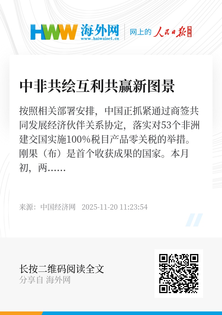 按照相关部署安排,中国正抓紧通过商签共同发展经济伙伴关系协定,落实对53个非洲建交国实施100%税目产品零关税的举措。刚果(布)是首个收获成果的国家。本月初,两国商务部门在上海签署双方关于共同发展经济伙伴关系协定早期收获的安排,中方将对刚方实施100%税目产品零关税,刚方也将进一步对中方开放市场。这只是中非以生动实践树立“全球南方”团结合作典范,携手共绘互利共赢发展新图景的力证之一。
