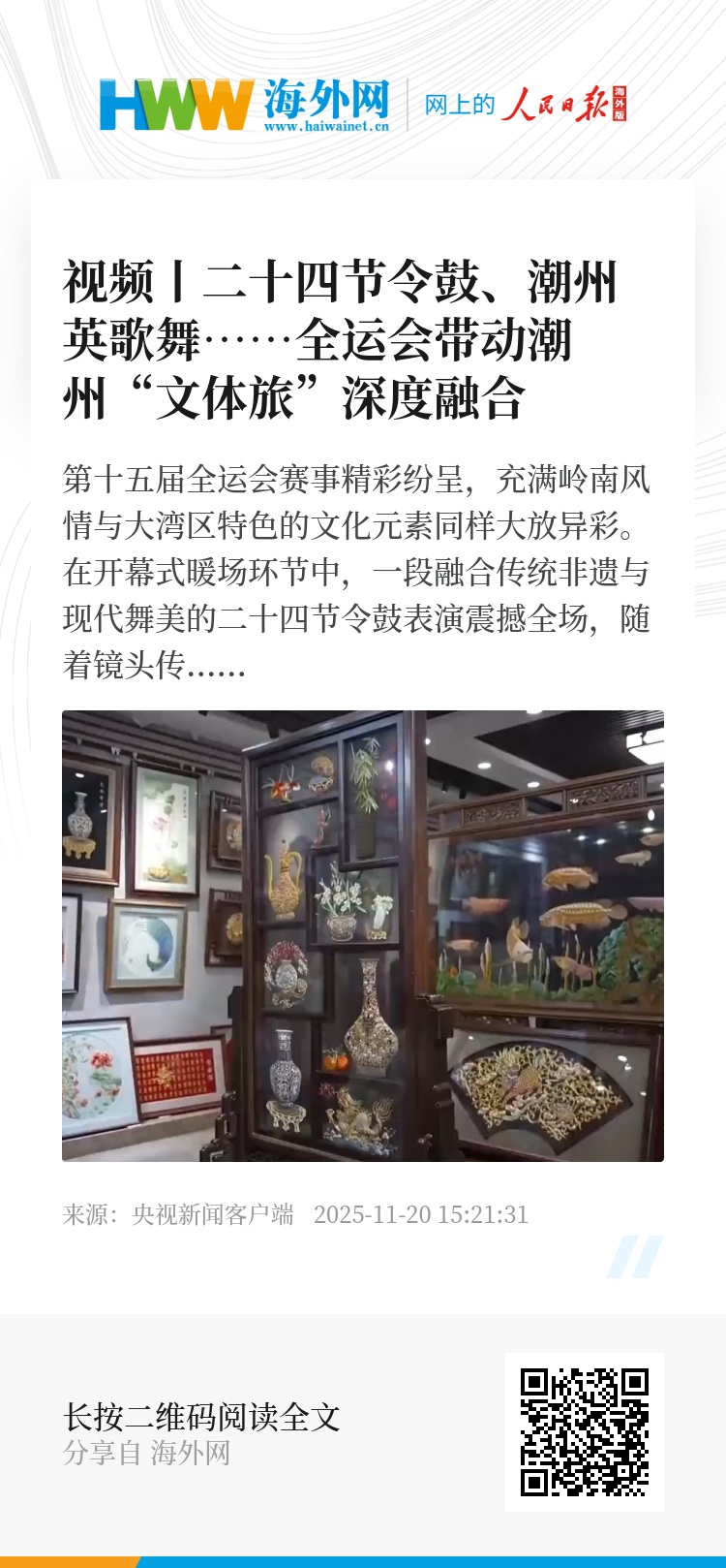 第十五届全运会赛事精彩纷呈,充满岭南风情与大湾区特色的文化元素同样大放异彩。在开幕式暖场环节中,一段融合传统非遗与现代舞美的二十四节令鼓表演震撼全场,随着镜头传遍全国,潮州独特的文化魅力也深入人心。