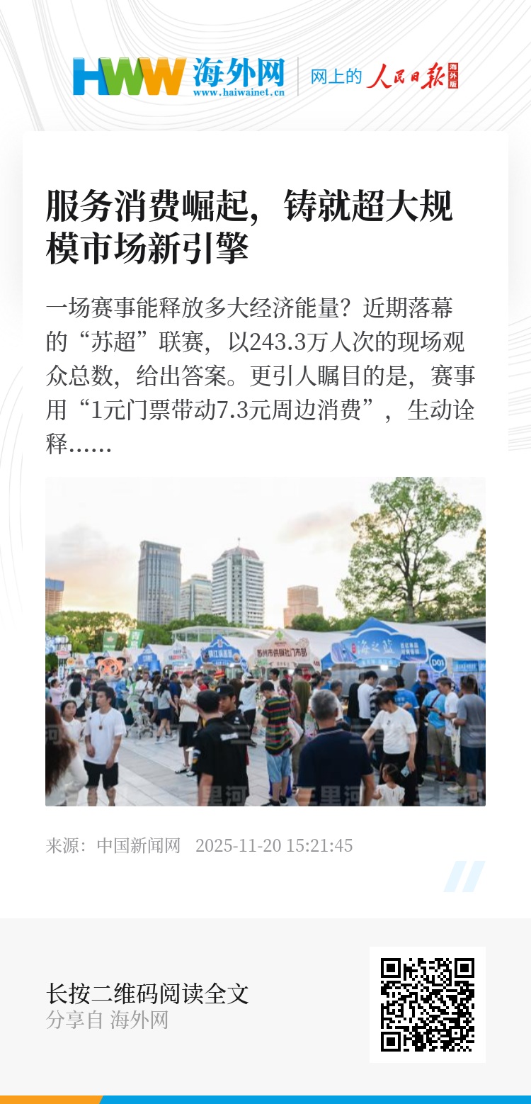 近期落幕的“苏超”联赛,以243.3万人次的现场观众总数,给出答案。更引人瞩目的是,赛事用“1元门票带动7.3元周边消费”,生动诠释了服务消费如何发挥杠杆效应,激活区域经济。