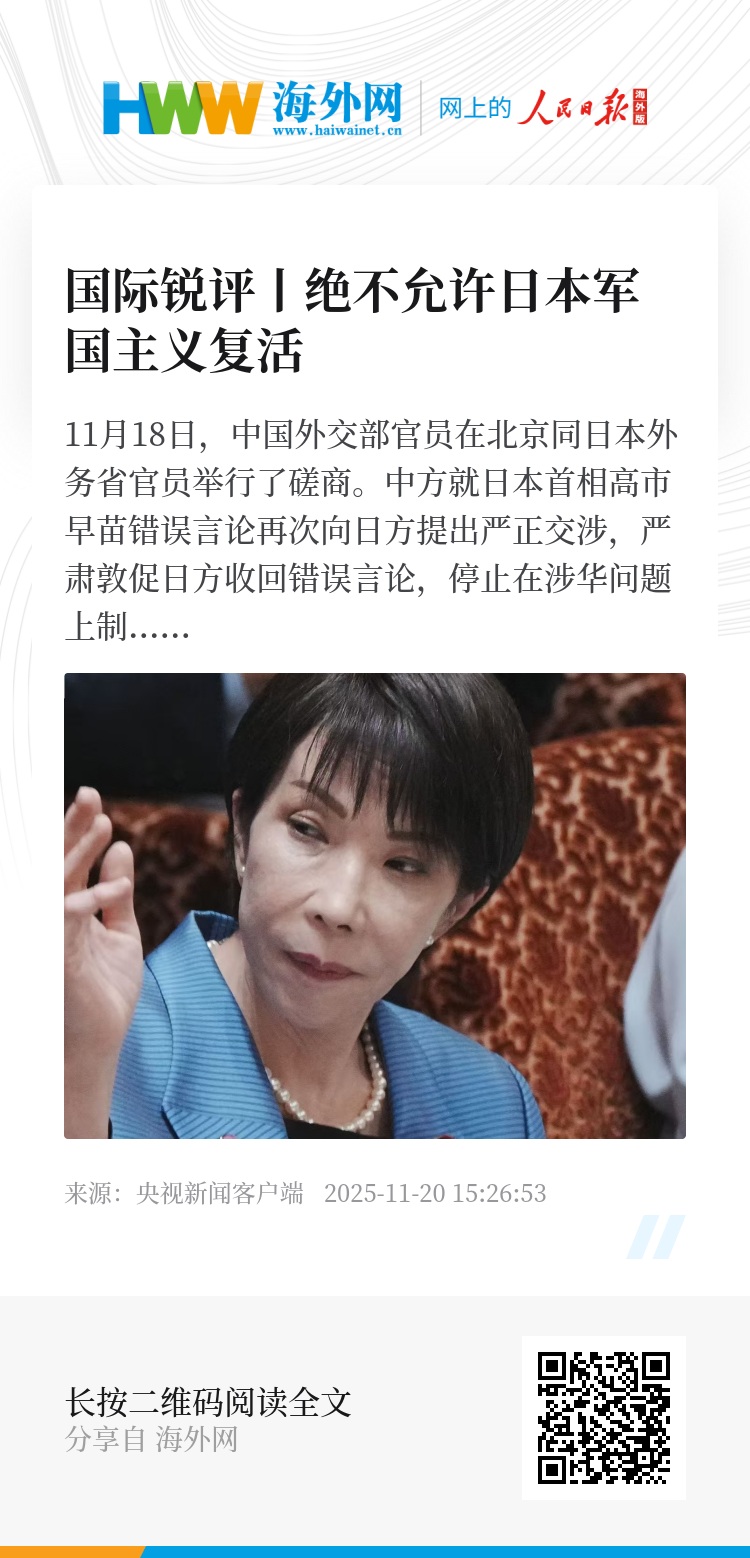 一系列的危险动向引发周边邻国广泛批评。俄罗斯联邦安全会议秘书绍伊古日前表示,高市早苗奉行历史修正主义政策,日方发表大量反俄言论,与其声称的对俄关系正常化意图互相矛盾;韩国政府对高市日前声称独岛(日本称竹岛)是日本“固有领土”表示严正抗议,并暂停了原定于11月举行的韩日联合演习。针对高市关于提高日本防卫费支出、提前修订国家安全战略等言论,朝鲜媒体发文批评日本暴露“战争国家的丑恶嘴脸”……高市早苗的挑衅言行引发周边多国同声抗议批评,为冷战结束以来所罕见。这表明,日本已经成为破坏东亚和平的重大风险源。
