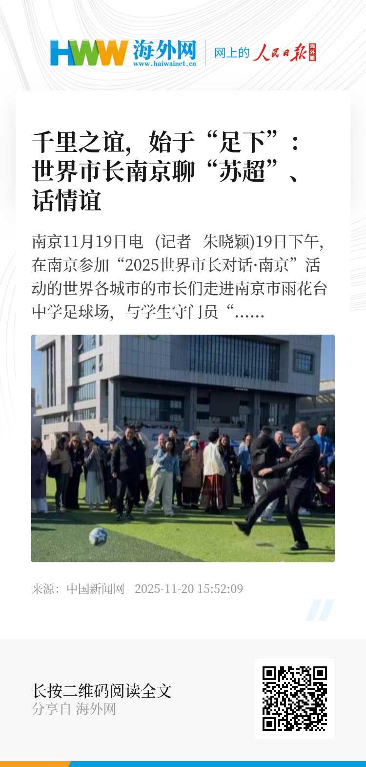 中新网南京11月19日电 (记者 朱晓颖)19日下午,在南京参加“2025世界市长对话·南京”活动的世界各城市的市长们走进南京市雨花台中学足球场,与学生守门员“过招”,感受“点球大战”的激情。“足球是世界通用语言”,多位市长在接受中新网记者采访时说。