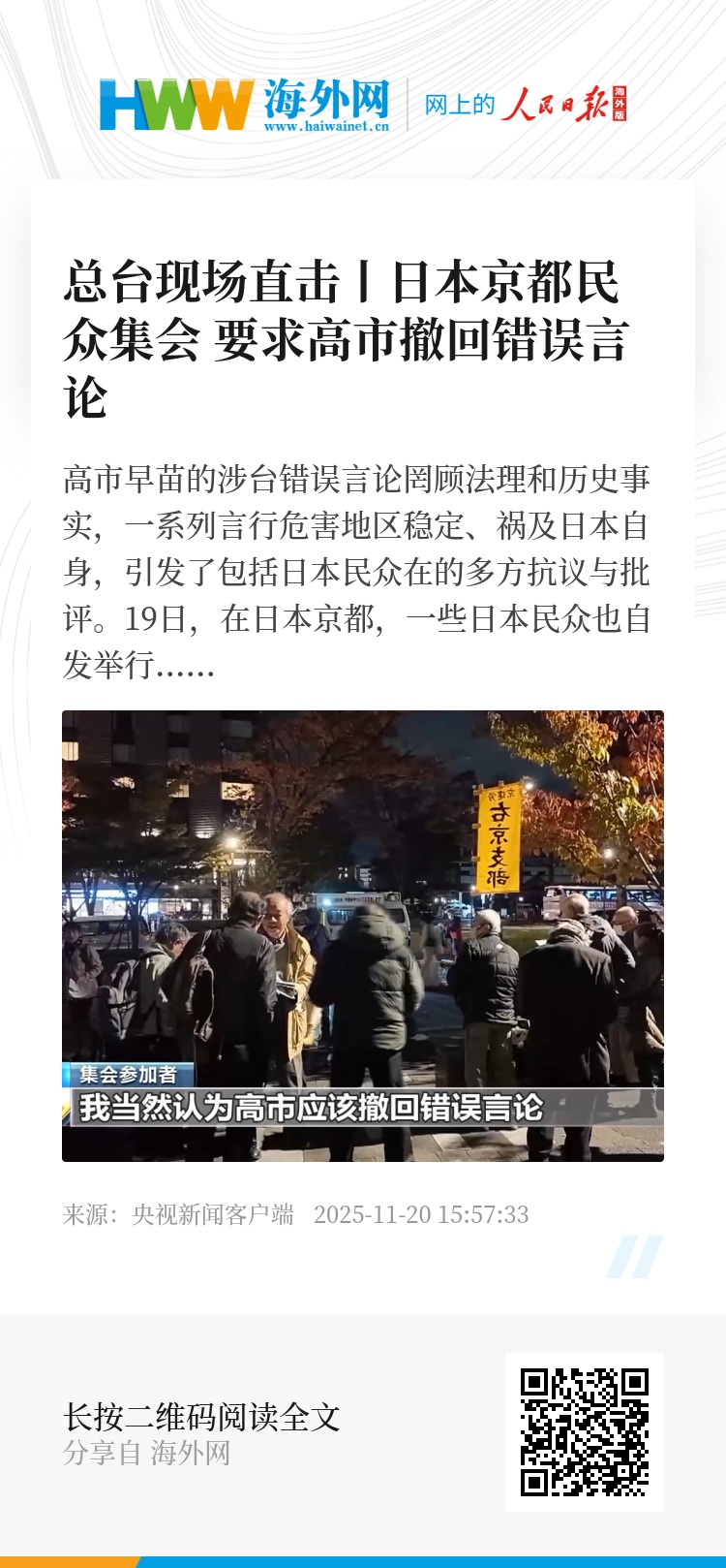 总台记者 何欣蕾:日本首相高市早苗近期涉台的错误言论在日本国内持续引发抗议和不满。19日在京都市役所前,当地民众自发举行集会,抗议高市的错误言行。像我身后的条幅,上面就写着“不要拿台湾作借口,挑起战争,高市早苗撤回言论”,以此来表达民众的心声。