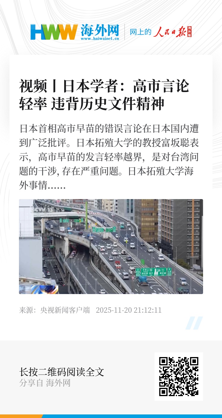日本首相高市早苗的错误言论在日本国内遭到广泛批评。日本拓殖大学的教授富坂聪表示,高市早苗的发言轻率越界,是对台湾问题的干涉,存在严重问题。