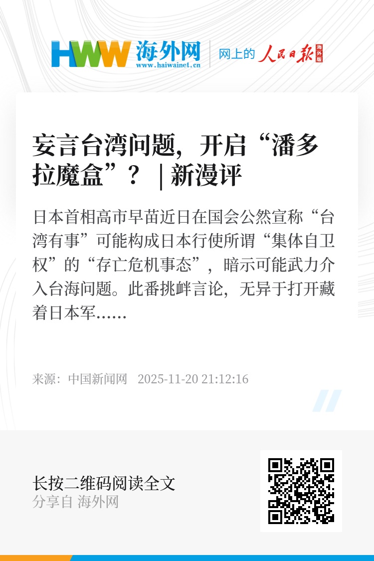 国际社会绝不允许日本军国主义否定历史、重蹈覆辙。如今,日本当政者妄图介入台海事务,是对国际正义的粗暴践踏、对战后国际秩序的公然挑衅。日本军国主义的“魔盒”一旦打开,后果不堪设想,只要“露头”,必将遭到迎头痛击!