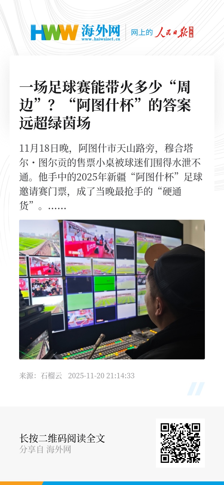 出租车司机阿布杜艾尼·伊利木对此深有体会。每场赛事结束,他都会提前到球场周边等候。“一半以上的乘客都是来看球的,开幕式那天上午,我就拉了70多人。”从美食区到交通服务,赛事经济的暖流正以足球公园为中心,向整座城市扩散。