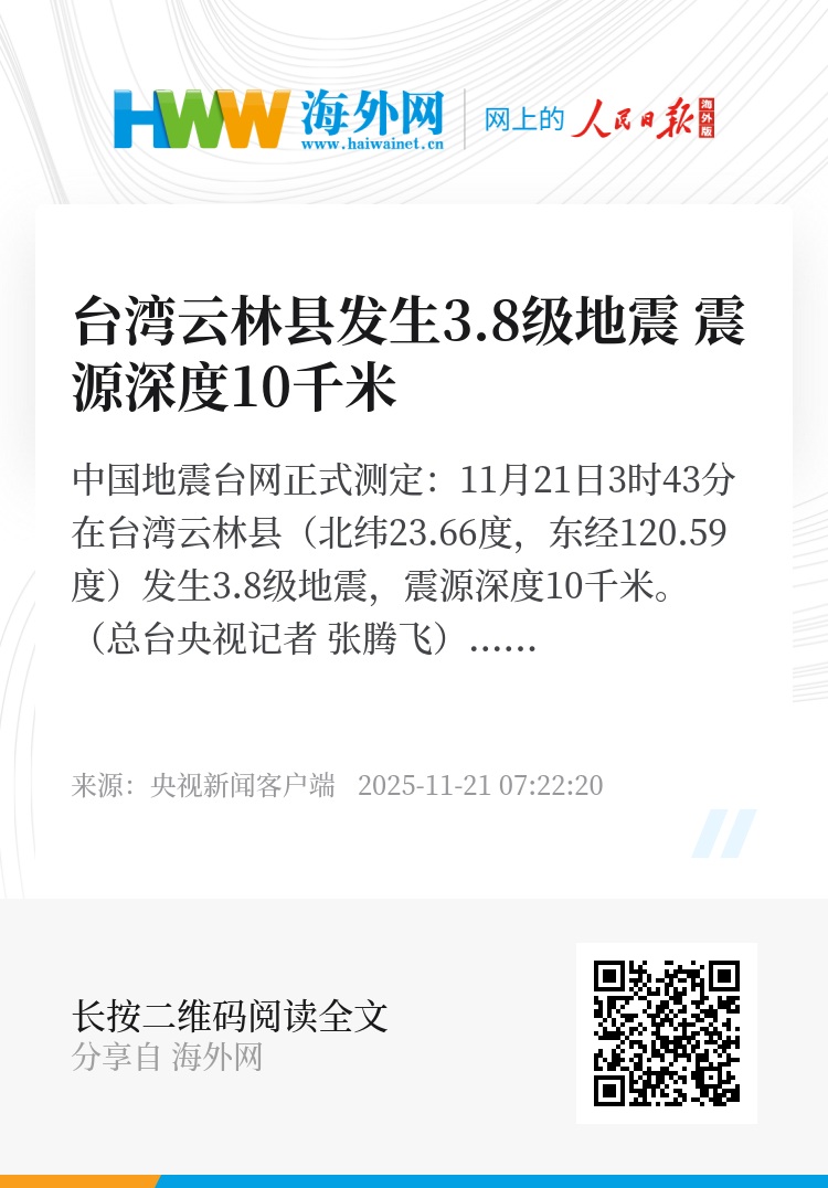 中国地震台网正式测定:11月21日3时43分在台湾云林县(北纬23.66度,东经120.59度)发生3.8级地震,震源深度10千米。(总台央视记者 张腾飞)