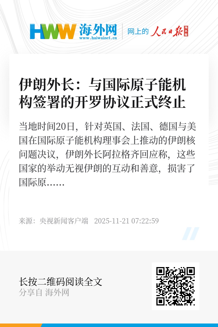 阿拉格齐称,三个欧洲国家通知联合国安理会启动“快速恢复制裁”机制,使得开罗协议不再是伊朗与国际原子能机构在保障监督领域合作的基础。20日当天,伊朗已正式致函国际原子能机构总干事,宣布开罗协议不再有效,并被伊朗视为终止。