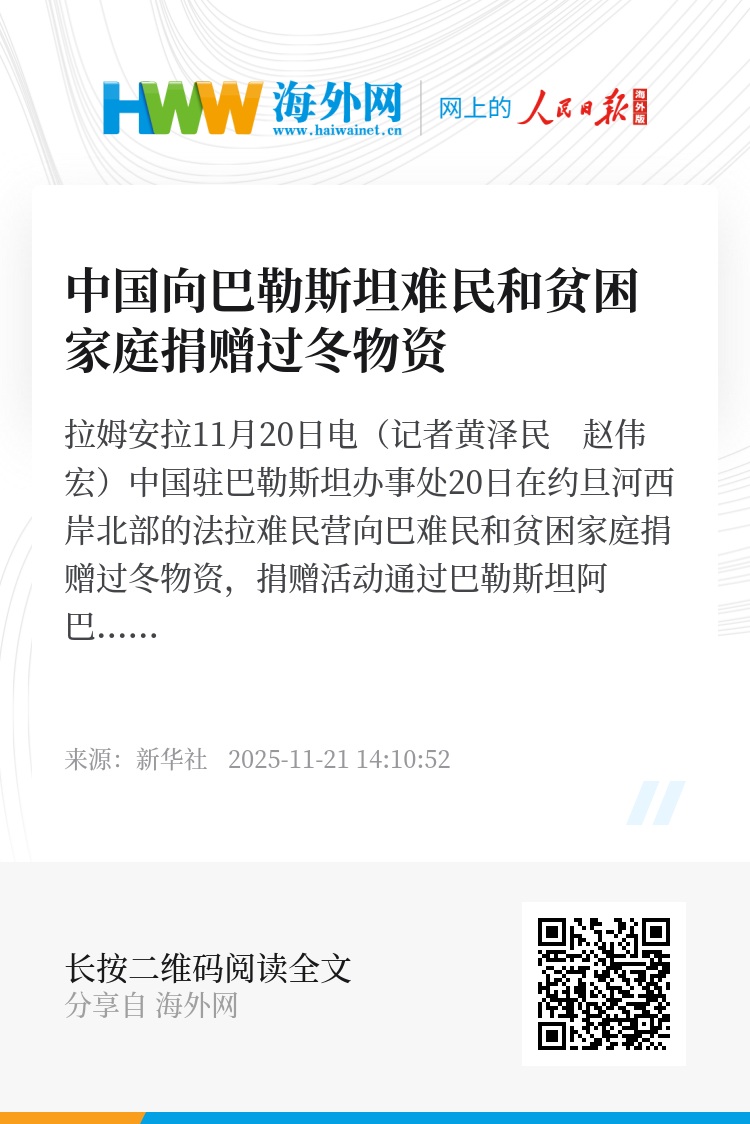 中巴双方还走访了北约旦河谷村镇,向当地村民发放了过冬物资。65岁村民奥达说,感谢中方前来了解情况并提供支援,这增强了他们坚守家园的信心。