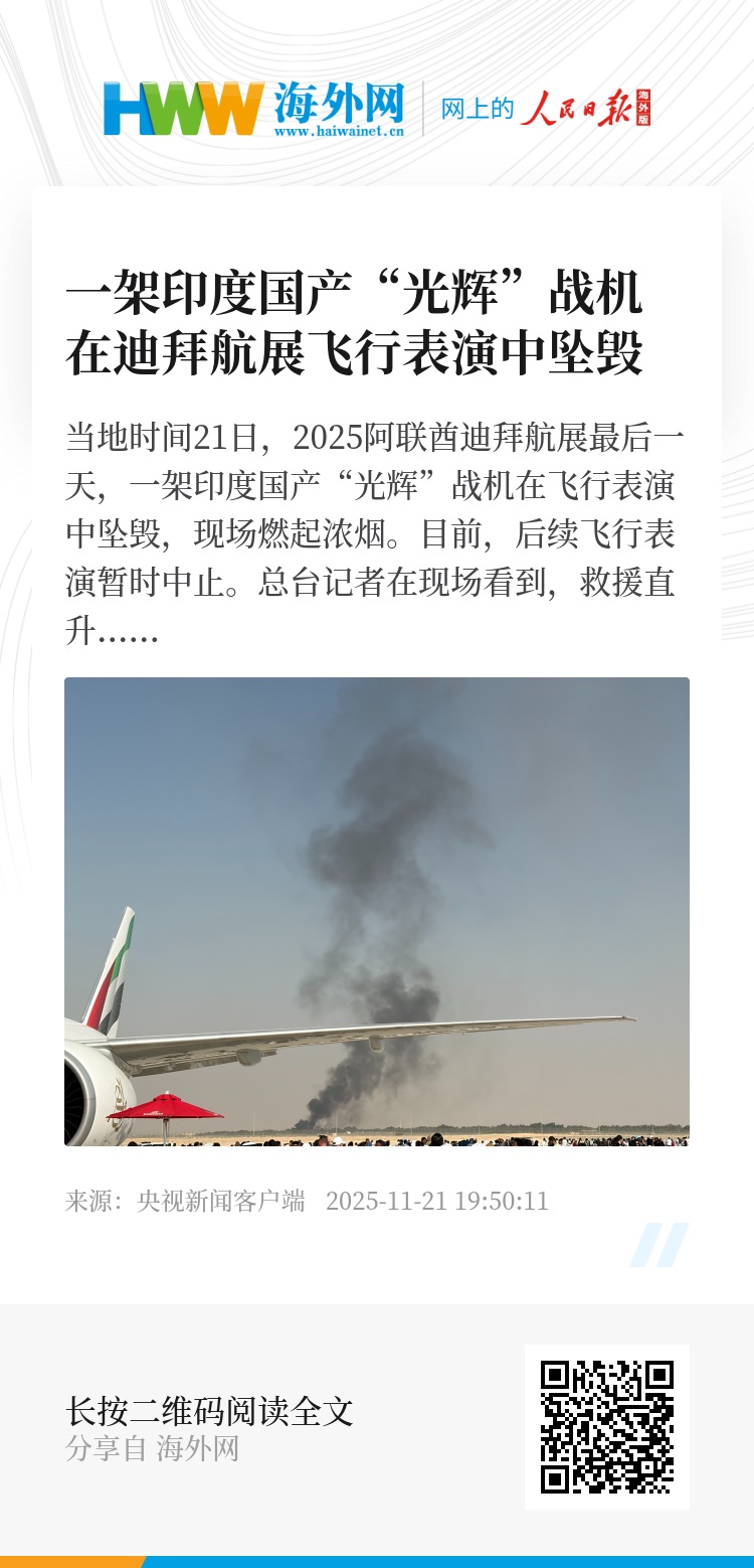 当地时间21日,2025阿联酋迪拜航展最后一天,一架印度国产“光辉”战机在飞行表演中坠毁,现场燃起浓烟。目前,后续飞行表演暂时中止。