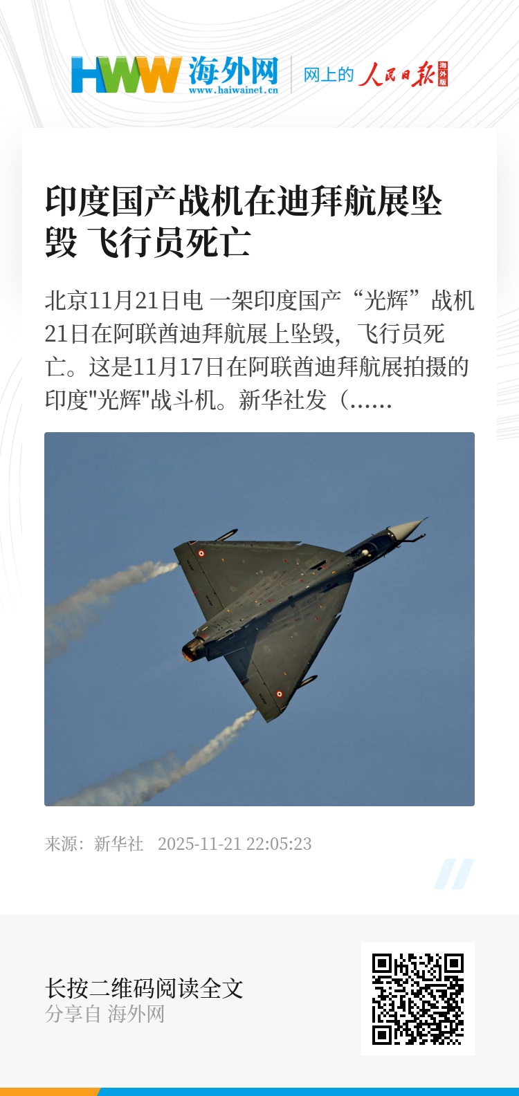 新华社北京11月21日电 一架印度国产“光辉”战机21日在阿联酋迪拜航展上坠毁,飞行员死亡。