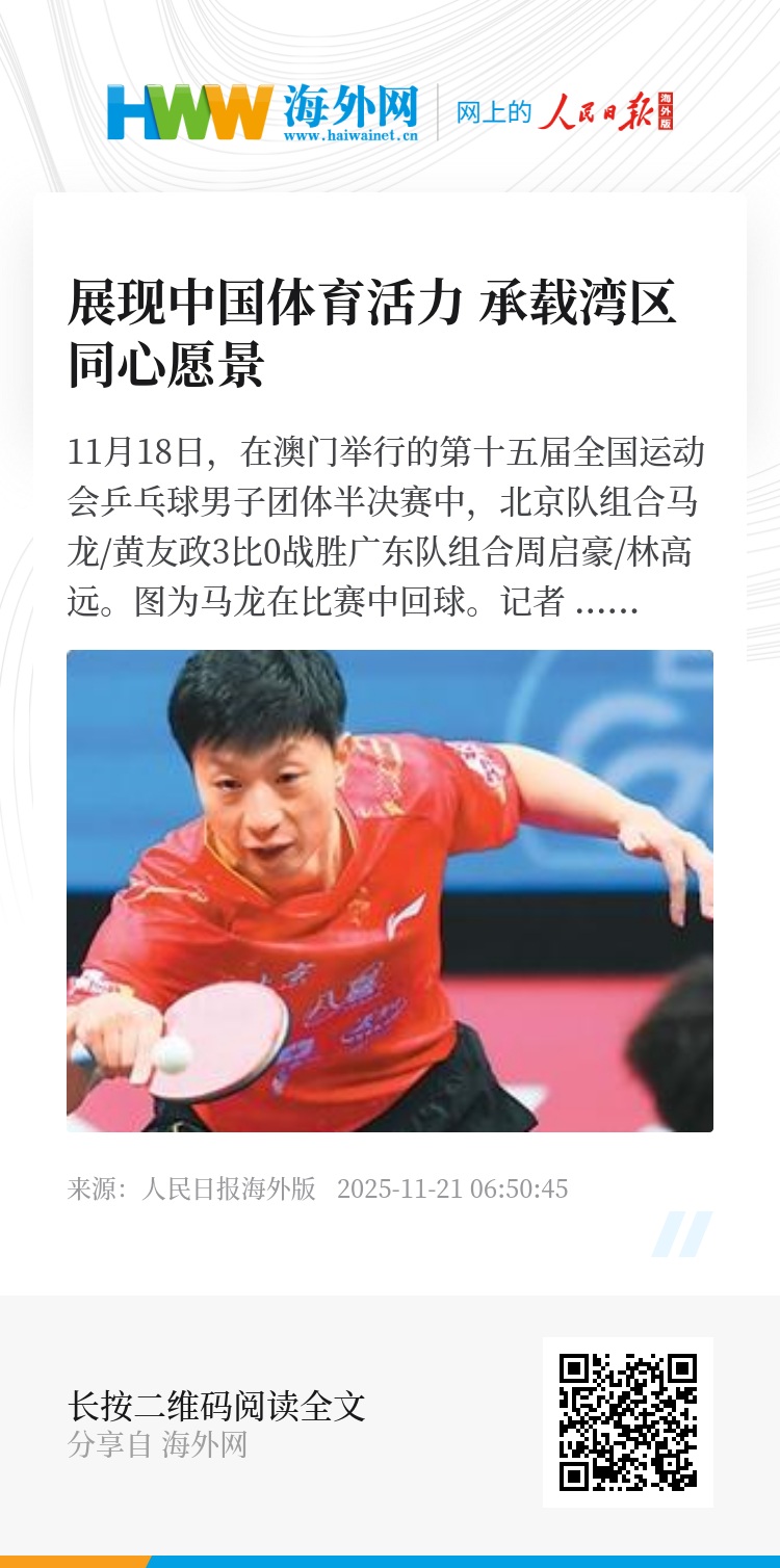 从珠海骑到澳门,从深圳跑到香港。十五运会以赛事为桥,推动三地“硬联通”“软联通”“心联通”水平不断提高,也将为大湾区建设富有活力和国际竞争力的一流湾区和世界级城市群提供“全运经验”。