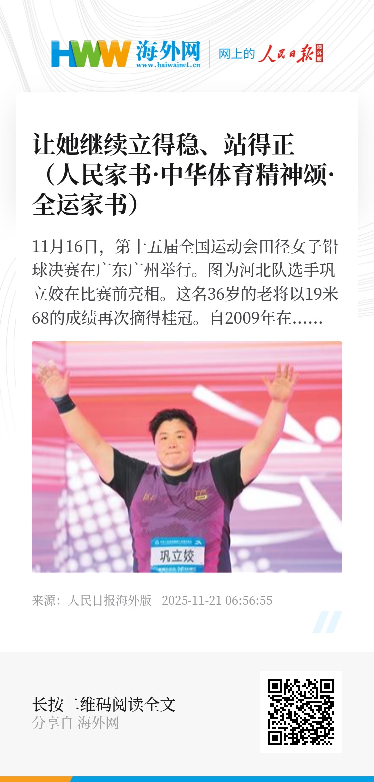 全运会结束后,我就要离开铅球赛场了。25年的运动生涯,我真的很舍不得,但也到了必须停下来的时候。您放心,虽然不扔铅球了,我还是会在体育这条路上继续干下去。国家培养了我,给了我这么多,我也想为这个项目多做点事,为年轻的孩子们撑一把,让她们的人生路走得比我更远、更顺。