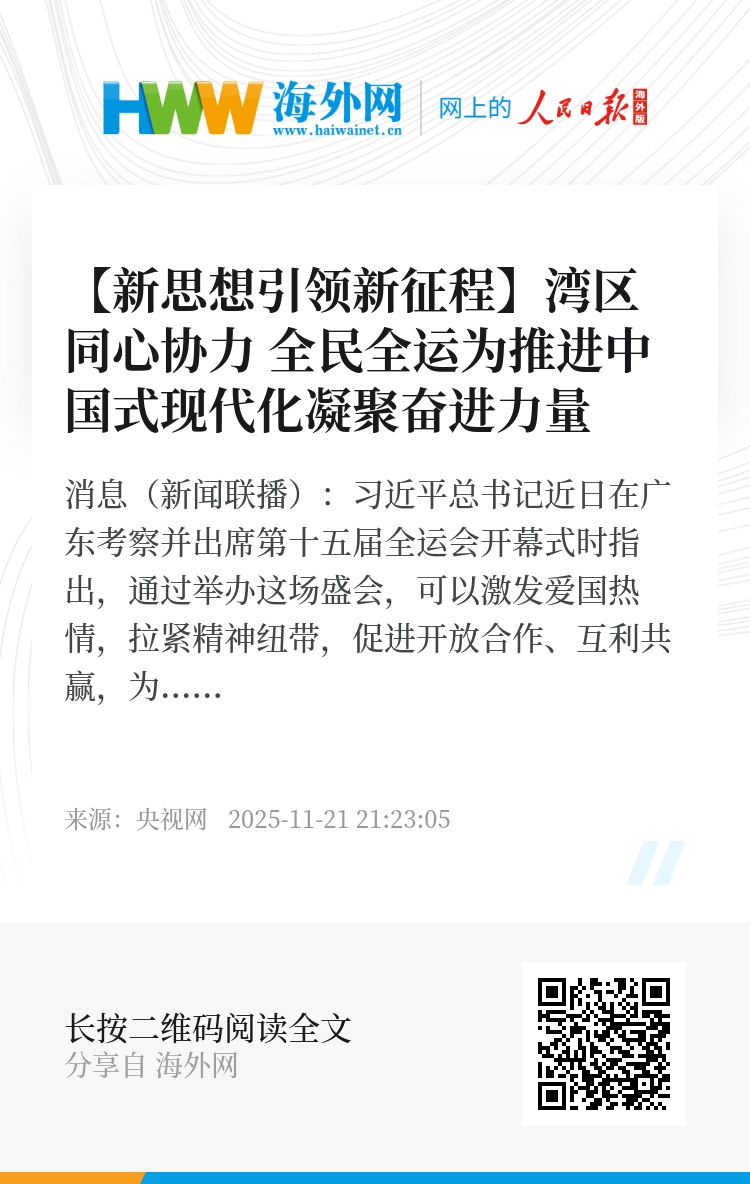 央视网消息(新闻联播):习近平总书记近日在广东考察并出席第十五届全运会开幕式时指出,通过举办这场盛会,可以激发爱国热情,拉紧精神纽带,促进开放合作、互利共赢,为大湾区建设营造良好氛围。从11月9日至21日,由粤港澳三地共同举办的这届全运会,燃动大湾区,生动诠释体育的激情与魅力;三地同心协力、交流融合,让大湾区焕发新的光彩。11月21日晚,本届全运会闭幕。这届盛会不仅展示了新时代中国体育事业发展的新成就,也生动展现了中国式现代化在粤港澳大湾区的万千气象。