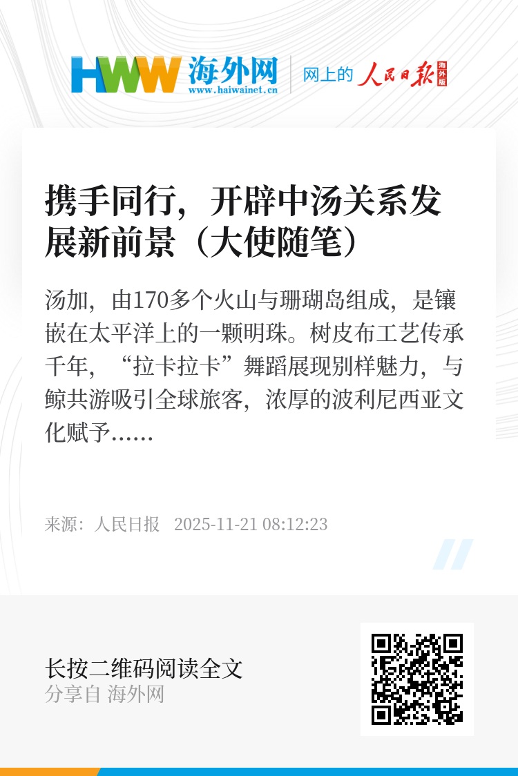 中汤两国虽相距遥远,但深厚历史渊源与友好交流合作将双方紧紧相连。图普六世国王此访必将进一步巩固双边关系政治基础,拓展务实合作,扩大人文交流,推动两国关系迈上新高。