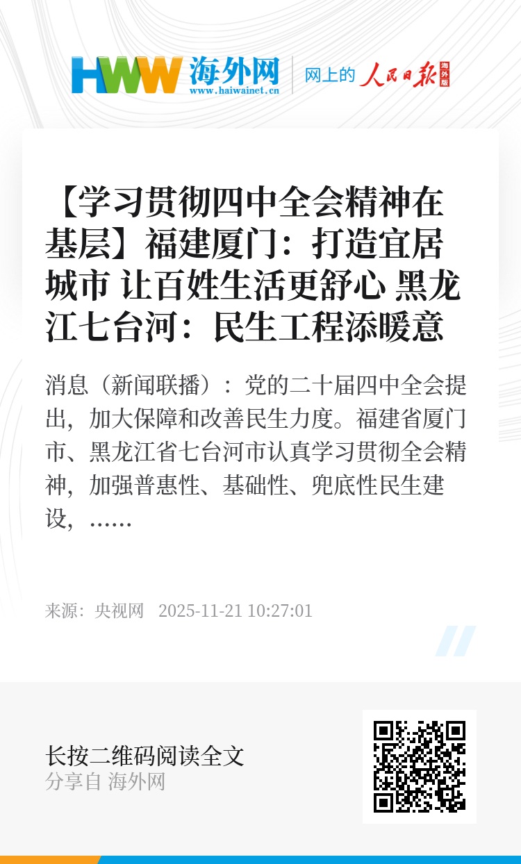 央视网消息(新闻联播):党的二十届四中全会提出,加大保障和改善民生力度。福建省厦门市、黑龙江省七台河市认真学习贯彻全会精神,加强普惠性、基础性、兜底性民生建设,不断提高百姓的幸福感、获得感。