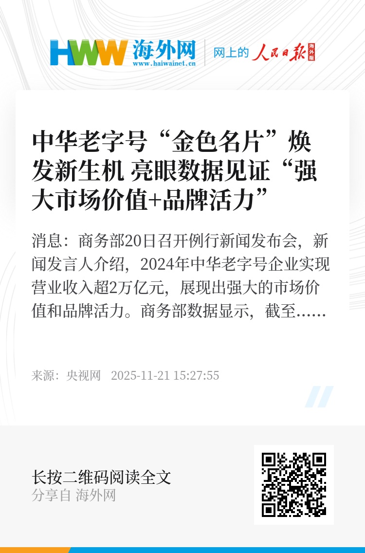 商务部新闻发言人何咏前称:“2024年,中华老字号企业实现营业收入超2万亿元、利润额超3500亿元,海外营收超500亿元,展现出强大的市场价值和品牌活力。”