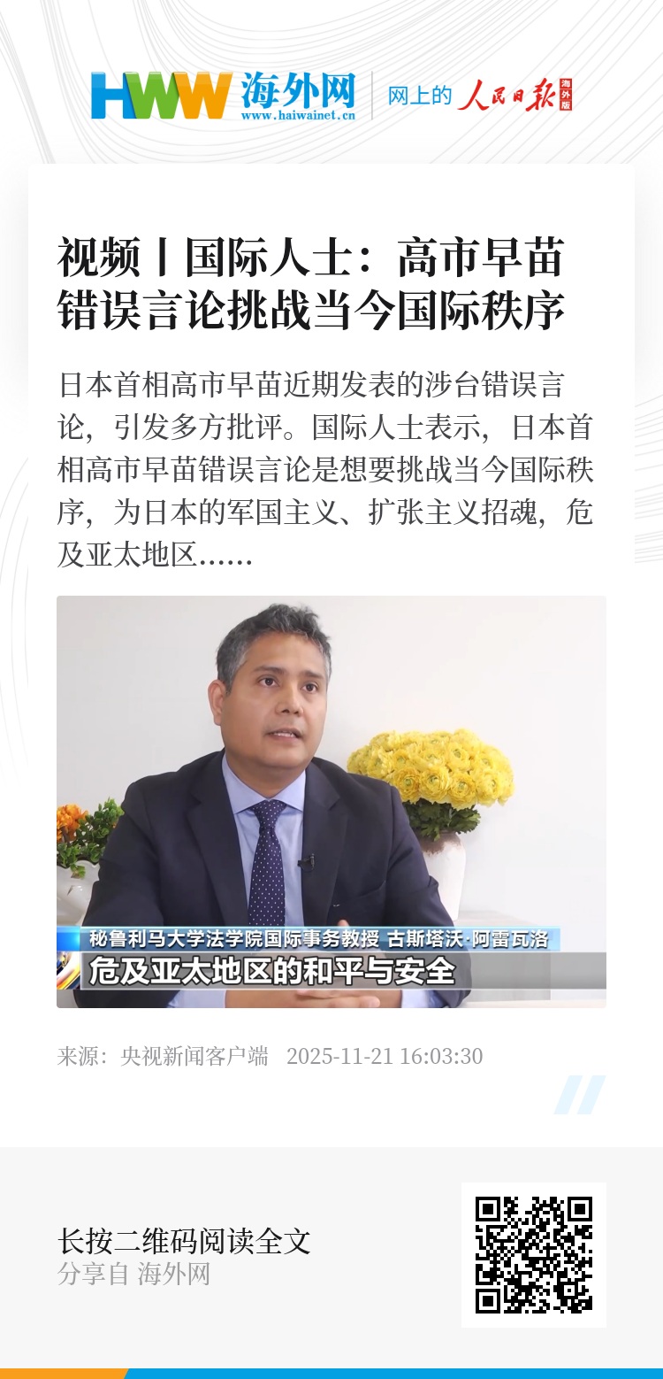 秘鲁利马大学法学院国际事务教授 古斯塔沃·阿雷瓦洛:高市早苗的错误言论危及亚太地区的和平与安全。日本经济界也反对她的言论,因为显然这会导致中日两国经贸关系紧张,而在这种情况下,损失更大的一方其实是日本,而非中国。