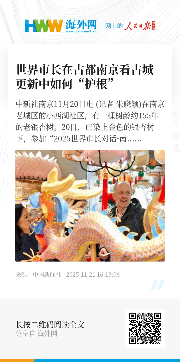 中新社南京11月20日电 (记者 朱晓颖)在南京老城区的小西湖社区,有一棵树龄约155年的老银杏树。20日,已染上金色的银杏树下,参加“2025世界市长对话·南京”活动的全球嘉宾围成一圈,听老树讲述古城更新中的“护根”故事。