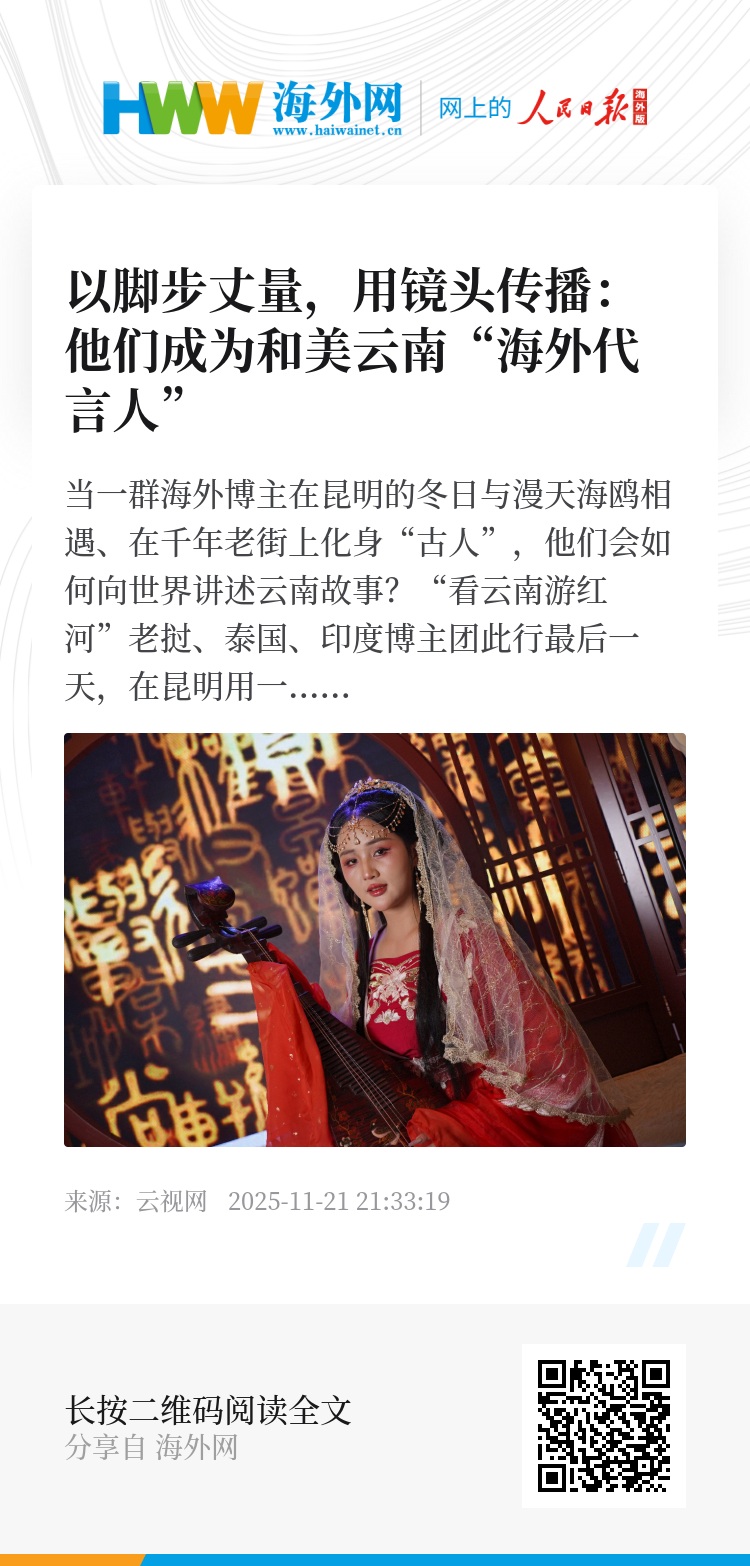“外眼看云南”系列活动,既是给“请进来”的周边国家知名博主们一段深度行走,发现云南的旅程,也是一场跨文化的对话与分享。通过博主们的镜头、文字与情感共鸣,云南的山水烟火转化为具有全球传播力的语言。通过他们的推介,万千普普通通的海外网友,看到了一个既承载千年古韵、又彰显未来气度的新云南——她不只是一处风景,更是一种视角,一种开放、包容、共享的生活态度,一个值得不断探索与回味的多彩家园。(记者 孙安然)