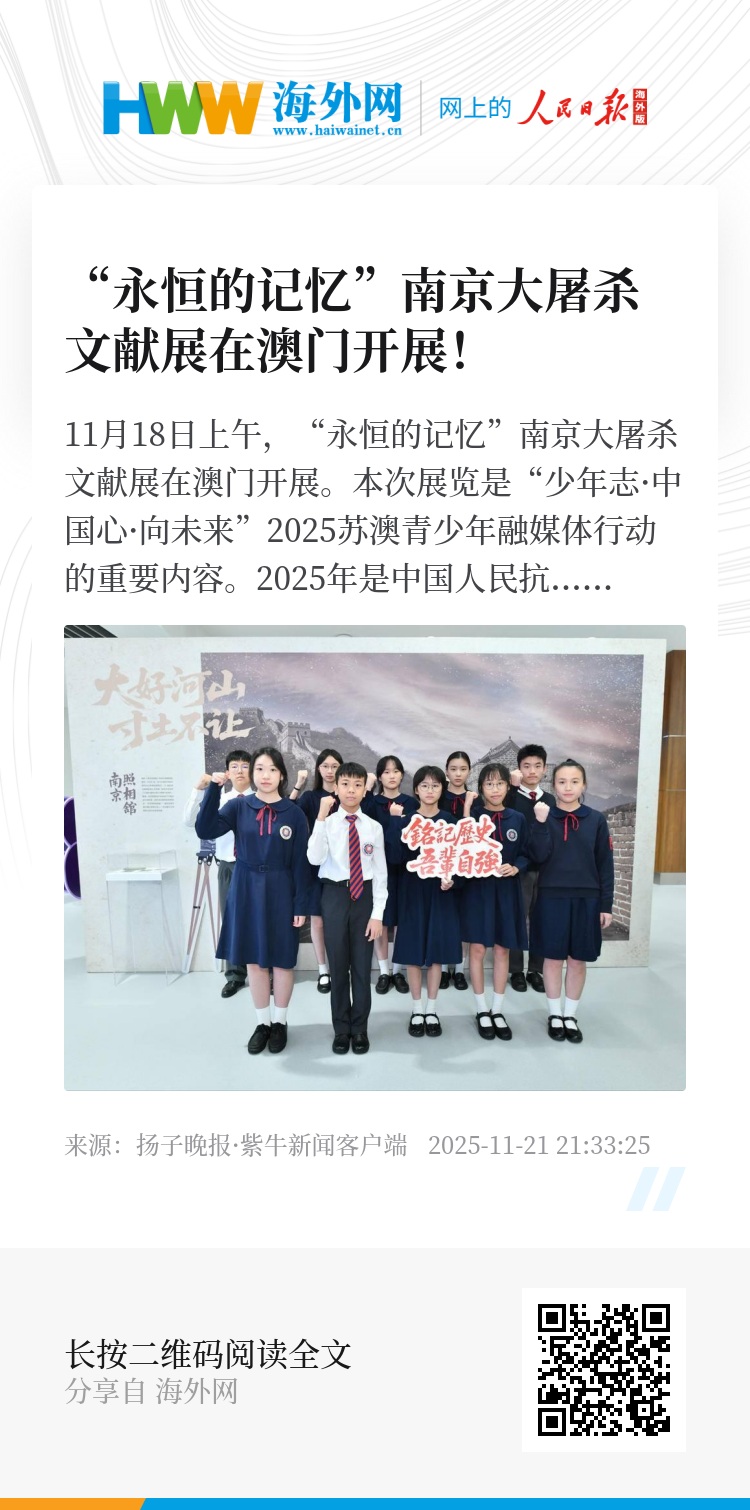 11月18日上午,“永恒的记忆”南京大屠杀文献展在澳门开展。本次展览是“少年志·中国心·向未来”2025苏澳青少年融媒体行动的重要内容。
