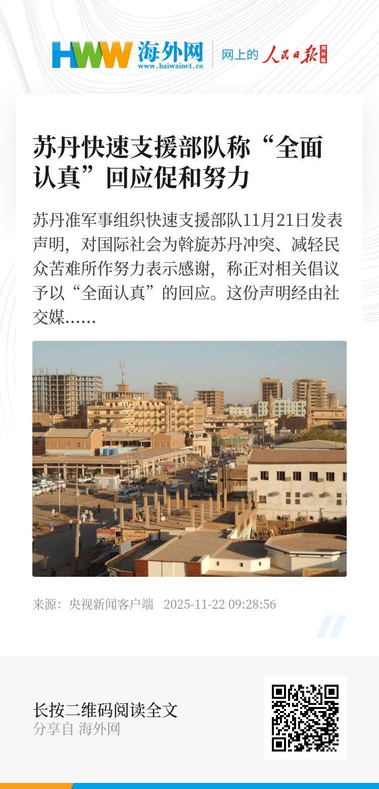 苏丹准军事组织快速支援部队11月21日发表声明,对国际社会为斡旋苏丹冲突、减轻民众苦难所作努力表示感谢,称正对相关倡议予以“全面认真”的回应。