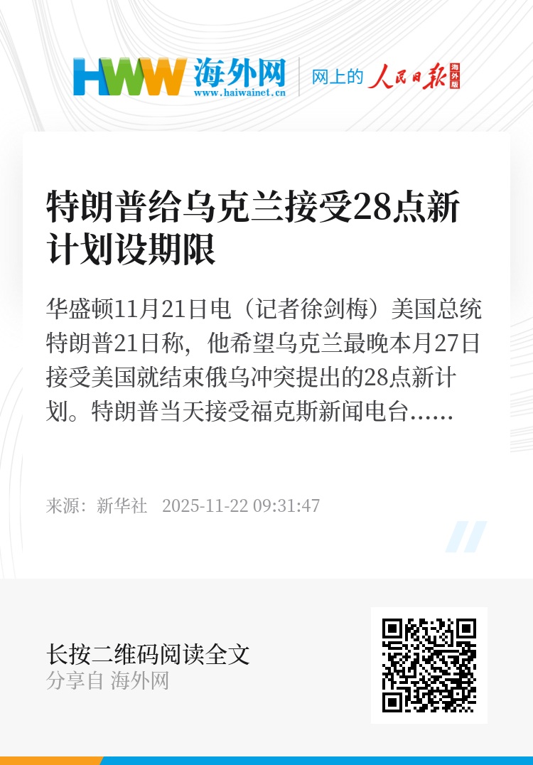 新华社华盛顿11月21日电(记者徐剑梅)美国总统特朗普21日称,他希望乌克兰最晚本月27日接受美国就结束俄乌冲突提出的28点新计划。