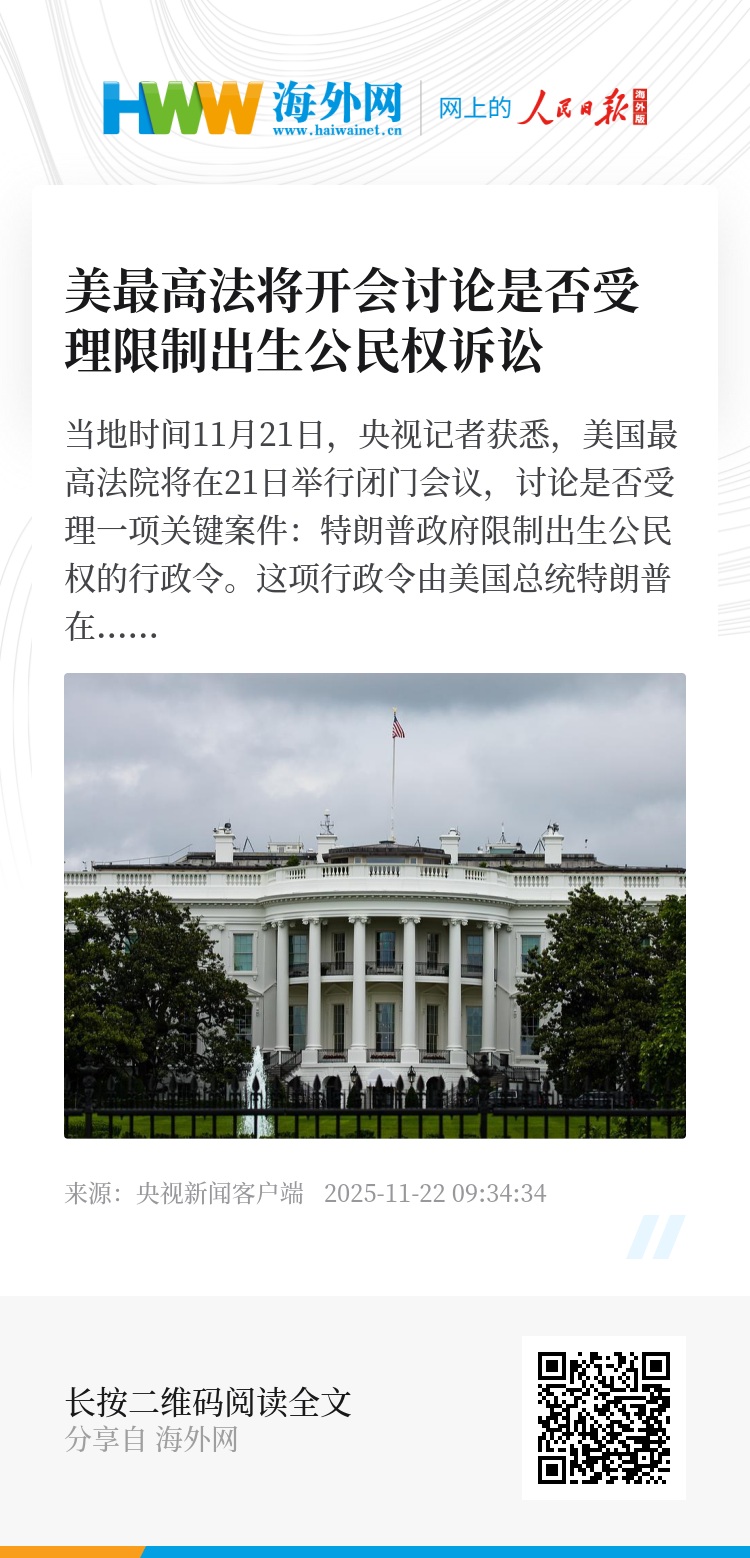当地时间11月21日,央视记者获悉,美国最高法院将在21日举行闭门会议,讨论是否受理一项关键案件:特朗普政府限制出生公民权的行政令。