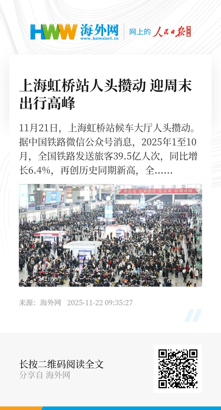 11月21日,上海虹桥站候车大厅人头攒动。据中国铁路微信公众号消息,2025年1至10月,全国铁路发送旅客39.5亿人次,同比增长6.4%,再创历史同期新高,全国铁路运输安全平稳有序。图源:视觉中国