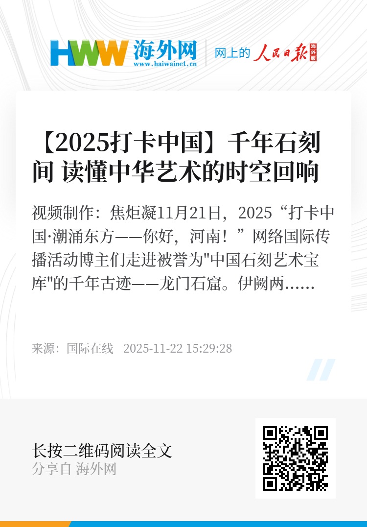 11月21日,2025“打卡中国·潮涌东方——你好,河南!”网络国际传播活动博主们走进被誉为"中国石刻艺术宝库"的千年古迹——龙门石窟。伊阙两岸,千年石窟群依山傍水、气势恢宏,北魏至唐代的造像历经千年风雨侵蚀,在时光流转中依旧栩栩如生。博主们循着历史脉络缓步前行,目光细细描摹石刻上的衣袂纹路与眉眼神韵,沉浸式感受中国古代石刻艺术的精湛技法、匠心巧思与跨越千年的深厚人文底蕴。此次打卡不仅让海外博主领略了中华艺术的璀璨魅力,更亲身见证了文化遗产的活化传承。作为古代文明交融的珍贵见证,龙门石窟正以跨越时空的力量,搭建起中外文化互鉴的桥梁,让世界读懂中国遗产的深厚底蕴与蓬勃的时代生命力。(文 袁艺航)