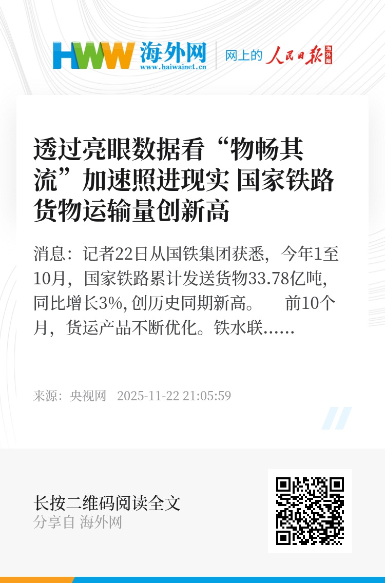 央视网消息:记者22日从国铁集团获悉,今年1至10月,国家铁路累计发送货物33.78亿吨,同比增长3%,创历史同期新高。
