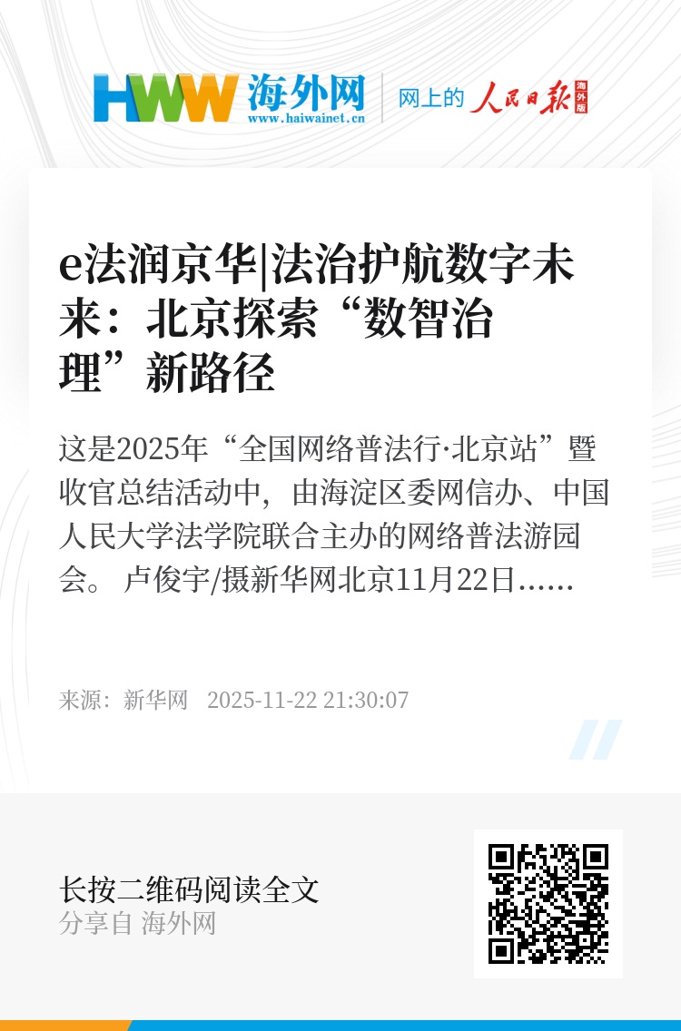 新华网北京11月22日电(记者 卢俊宇)2025年“全国网络普法行·北京站”暨收官总结活动19日在京启动。活动深入贯彻落实中央全面依法治国工作会议精神,以“e法善治 网聚同心”为主题,创新普法内容供给和宣传,推动网络法治精神浸润人心。
