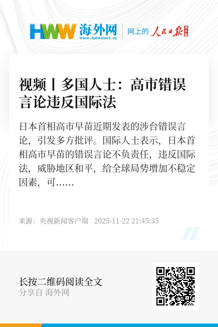 日本首相高市早苗近期发表的涉台错误言论,引发多方批评。国际人士表示,日本首相高市早苗的错误言论不负责任,违反国际法,威胁地区和平,给全球局势增加不稳定因素,可能引发严重后果。