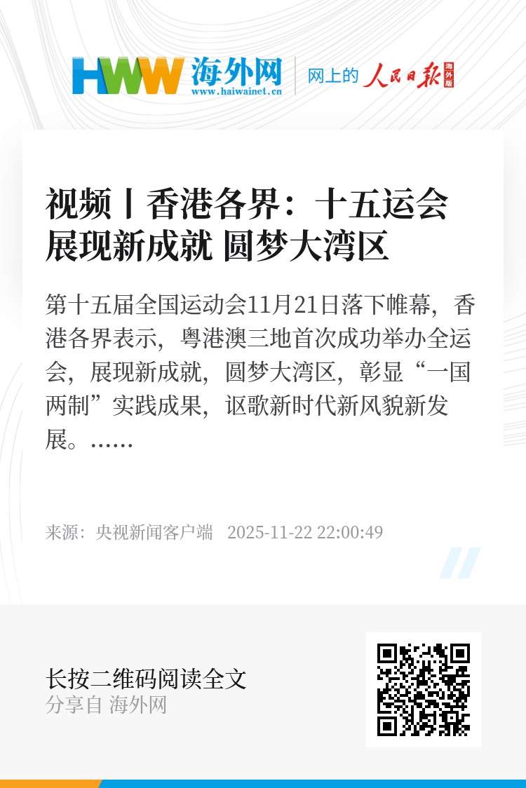 第十五届全国运动会11月21日落下帷幕,香港各界表示,粤港澳三地首次成功举办全运会,展现新成就,圆梦大湾区,彰显“一国两制”实践成果,讴歌新时代新风貌新发展。