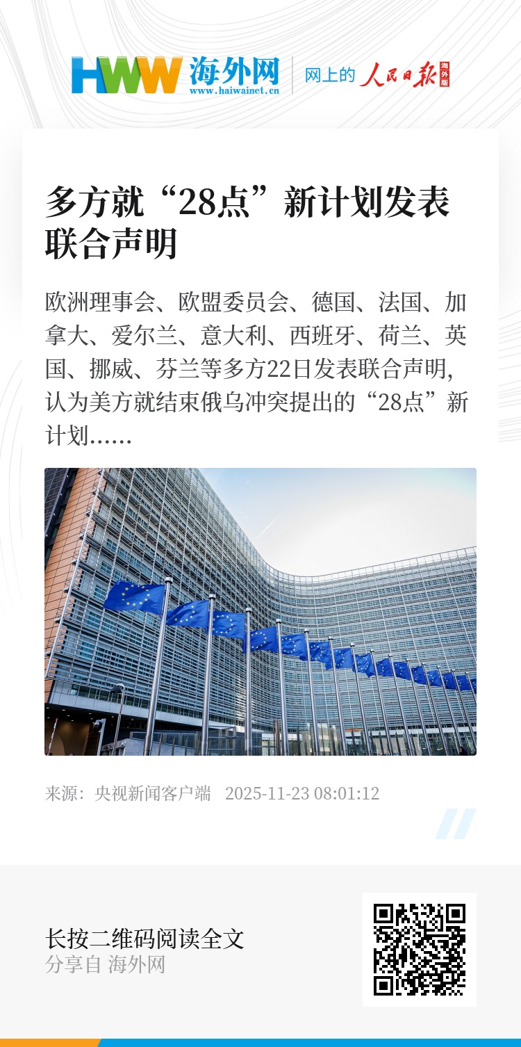 欧洲理事会、欧盟委员会、德国、法国、加拿大、爱尔兰、意大利、西班牙、荷兰、英国、挪威、芬兰等多方22日发表联合声明,认为美方就结束俄乌冲突提出的“28点”新计划可以作为基础,但仍需要额外的工作。