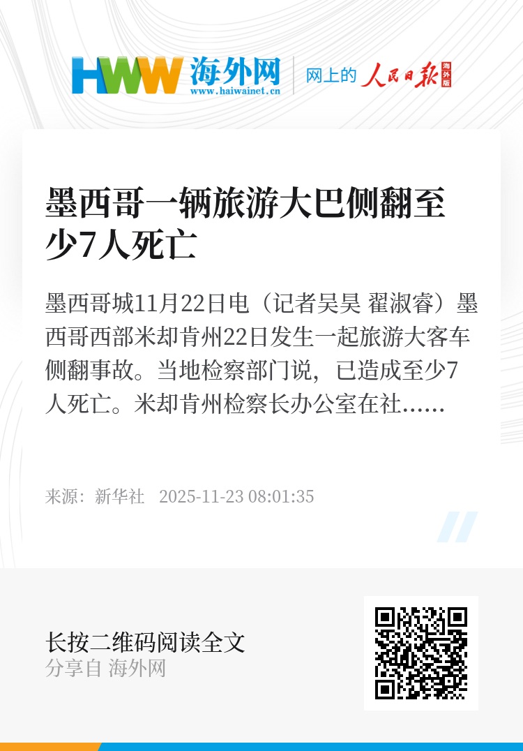 新华社墨西哥城11月22日电(记者吴昊 翟淑睿)墨西哥西部米却肯州22日发生一起旅游大客车侧翻事故。当地检察部门说,已造成至少7人死亡。