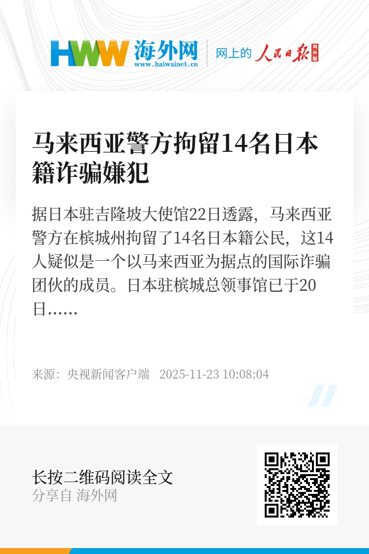 据日本驻吉隆坡大使馆22日透露,马来西亚警方在槟城州拘留了14名日本籍公民,这14人疑似是一个以马来西亚为据点的国际诈骗团伙的成员。日本驻槟城总领事馆已于20日收到马来西亚警方的通报。目前案件仍在调查中,预计详情将于下周公布。警方称,所有被捕人员在调查结束后将被遣返回日本。
