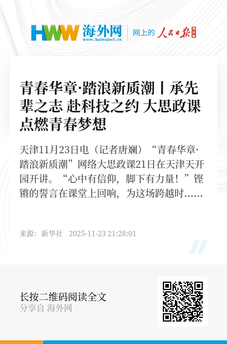 新华网天津11月23日电(记者唐斓)“青春华章·踏浪新质潮”网络大思政课21日在天津天开园开讲。“心中有信仰,脚下有力量!”铿锵的誓言在课堂上回响,为这场跨越时空的精神传承与思想激荡拉开序幕。