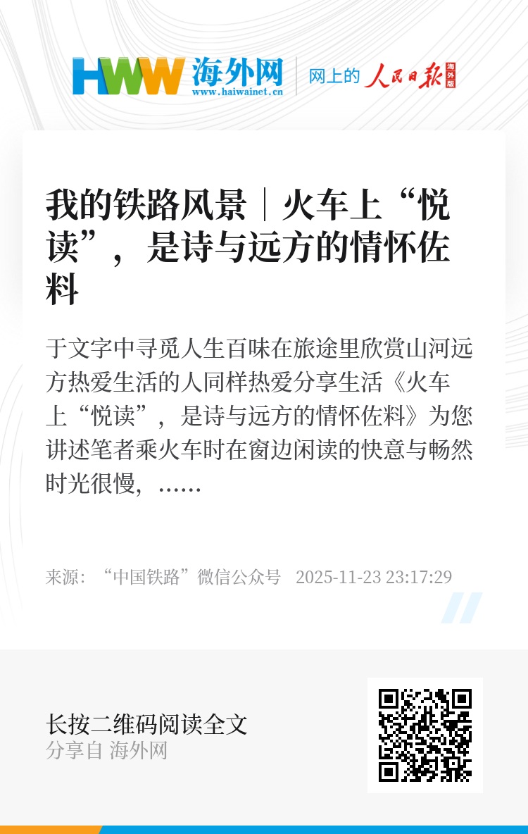 钢轨尽处是远方,停站下车是当下,走心文字皆为诗。在火车上读书,不必刻意追赶时间。午后片刻的从容,深夜时分的静谧,周末的悠闲,深秋的清寒,都刚刚好——这便是生活最美的模样:既有脚踏实地的安稳,亦有诗与远方的浪漫。在时光里慢慢走,慢慢品,便不负此行。