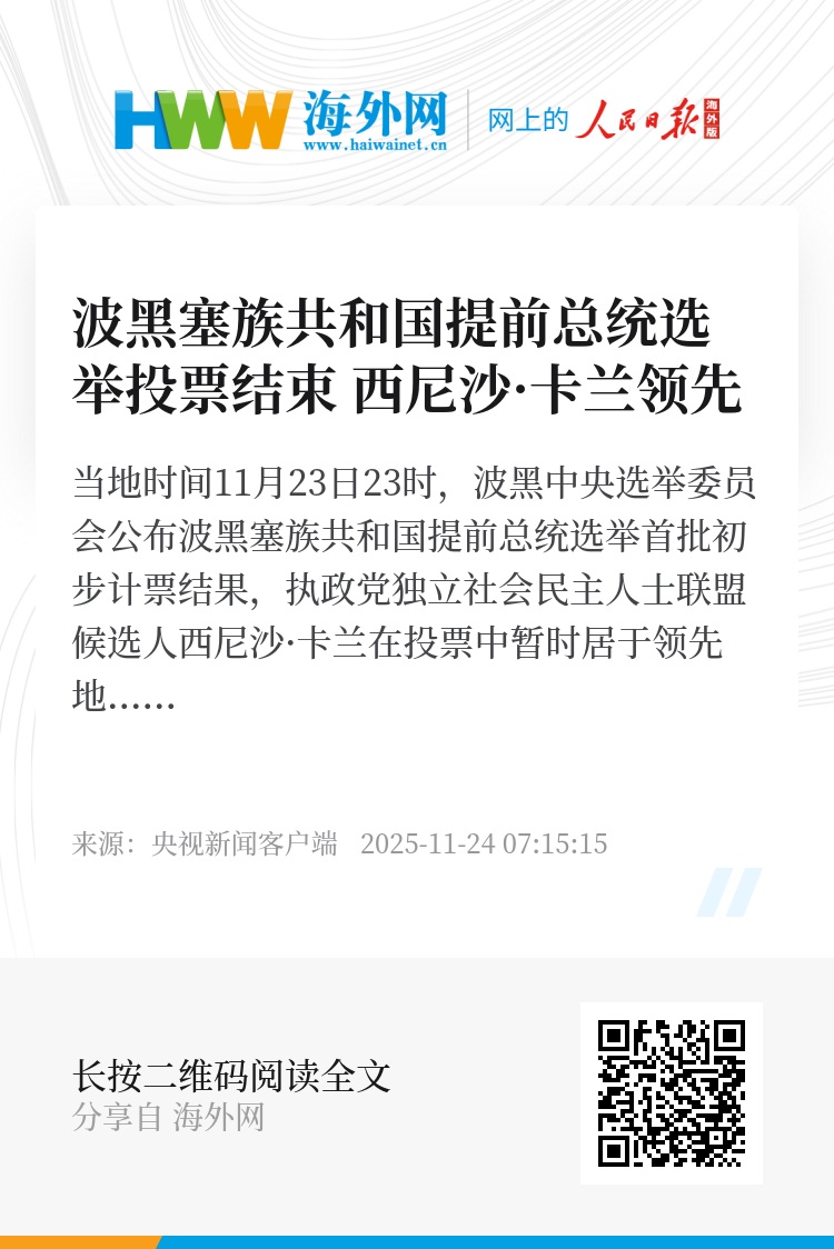 当地时间11月23日23时,波黑中央选举委员会公布波黑塞族共和国提前总统选举首批初步计票结果,执政党独立社会民主人士联盟候选人西尼沙·卡兰在投票中暂时居于领先地位。