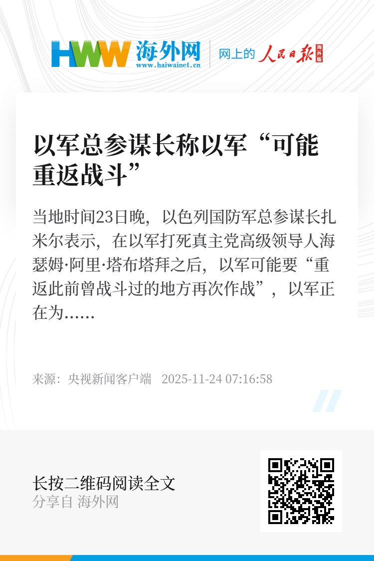 当地时间23日晚,以色列国防军总参谋长扎米尔表示,在以军打死真主党高级领导人海瑟姆·阿里·塔布塔拜之后,以军可能要“重返此前曾战斗过的地方再次作战”,以军正在为此做准备。