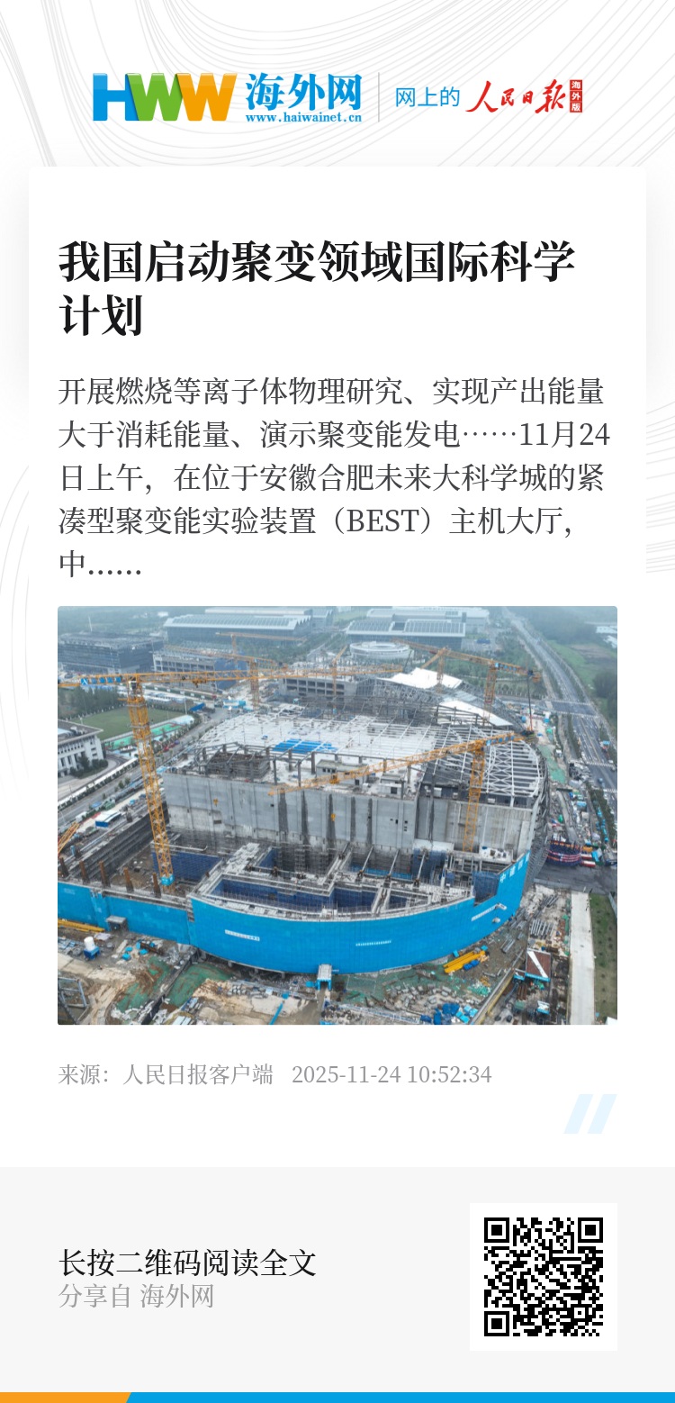 根据国际科学计划,等离子体物理研究所将面向全球开放包括BEST在内的多个核聚变大科学装置平台,设立开放科研基金、资助高频次专家互访交流。来自法国、英国、德国等十余个国家的聚变科学家共同签署《合肥聚变宣言》,该宣言倡导开放共享与合作共赢精神,鼓励各国的科研人员到中国开展聚变合作研究。