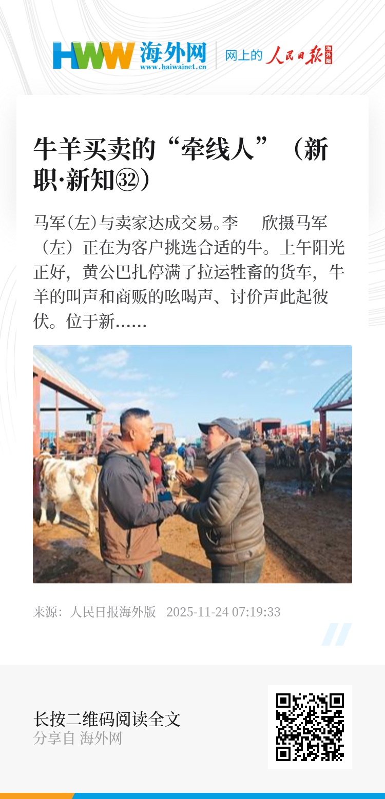 今年7月,人社部正式发布第七批新职业目录,“牲畜经纪人”首次作为独立工种亮相。这个曾在乡间被称为“牲口贩子”的行当,正式成为国家认证的一项新职业。